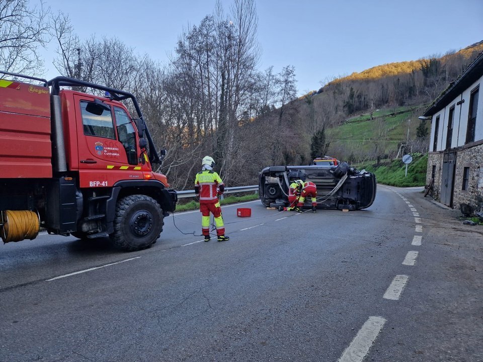 Los Bomberos del 112 del Gobierno de Cantabria han inertizado el vehículo, lo han colocado en su posición original para su retirada y limpiado un derrame en la vía.