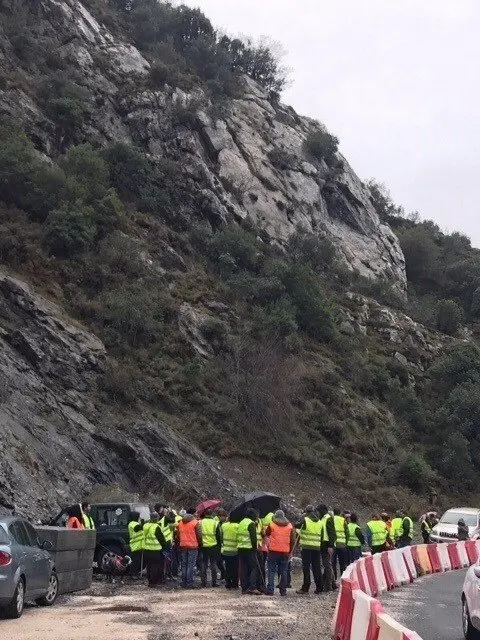 Los manifestantes han recorrido este viernes, ataviados con chalecos amarillos, y bajo la lluvia unos tres kilómetros del Desfiladero, los que hay desde la entrada de esta vía en su vertiente lebaniega, y ha recorrido la N-621 hasta los aparcamientos de Sotama, cercanos a la localidad de Tama, donde se ha leído el manifiesto.