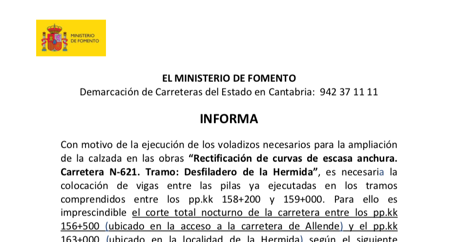 Con motivo de la ejecución de los voladizos necesarios para la ampliación de la calzada en las obras “Rectificación de curvas de escasa anchura. Carretera N-621. Tramo: Desfiladero de la Hermida”, es necesaria la colocación de vigas entre las pilas ya ejecutadas en los tramos comprendidos entre los pp.kk 158+200 y 159+000. Para ello es imprescindible el corte total nocturno de la carretera entre los pp.kk 156+500 (ubicado en la acceso a la carretera de Allende) y el pp.kk 163+000 (ubicado en la localidad de La Hermida) según el siguiente calendario del mes de septiembre: