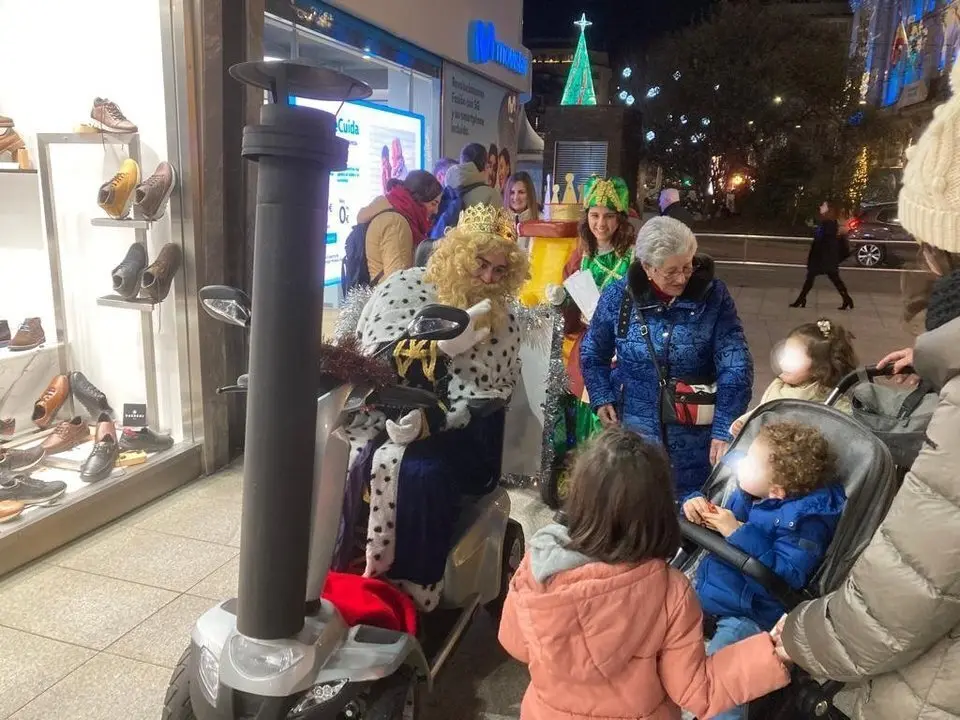Se trata de una campaña de dinamización comercial navideña en la que Su Majestad, junto a un Paje Real, está repartiendo regalos a los niños que se acercan a saludarle.