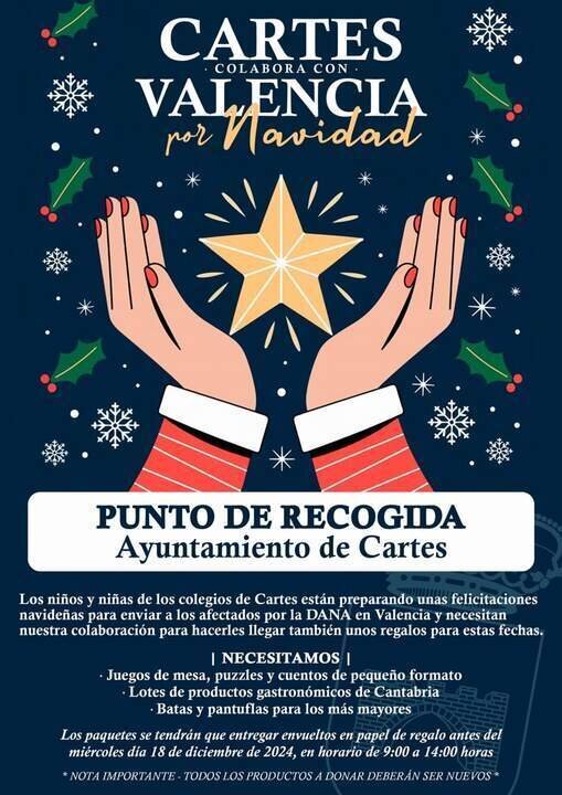 El Ayuntamiento de Cartes, junto a la comunidad educativa del municipio, ha puesto en marcha un proyecto solidario para enviar regalos durante las fechas navideñas a los afectados por la DANA en la Comunidad Valenciana.