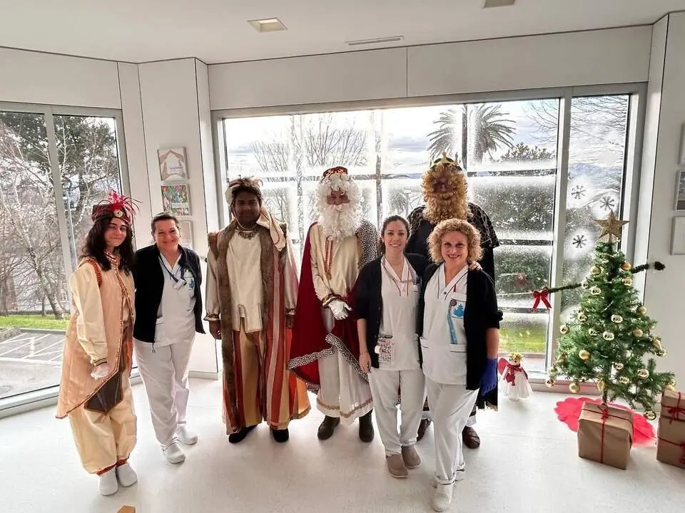 Los Reyes Magos han visitado este domingo el Hospital Santa Clotilde en Santander donde, acompañados de un paje, han llevado la ilusión a los pacientes de las diferentes unidades y servicios del centro a los que han entregado un obsequio.