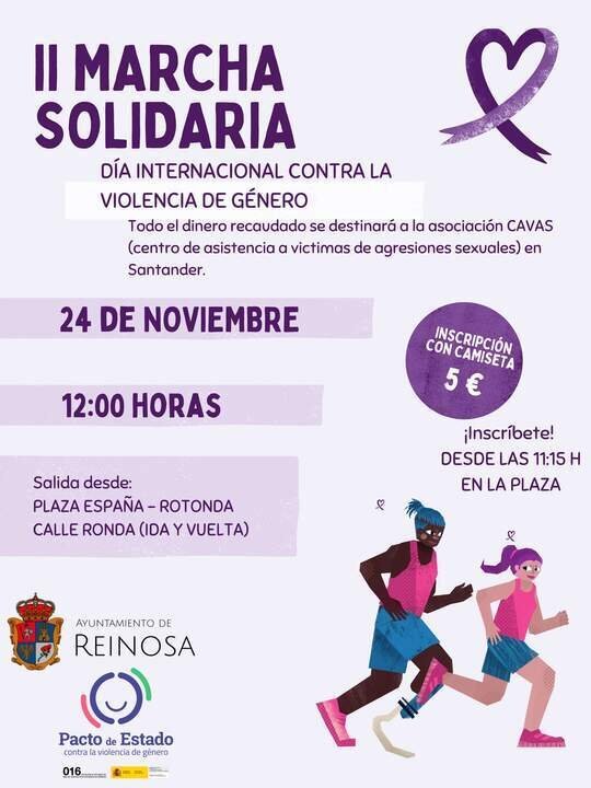 El Ayuntamiento de Reinosa ha organizado, a través de la Concejalía de Igualdad, la segunda Marcha Solidaria contra la Violencia de Género, una actividad con la que este próximo domingo, 24 de noviembre, el Consistorio inaugura los actos previstos para conmemorar el 25N.