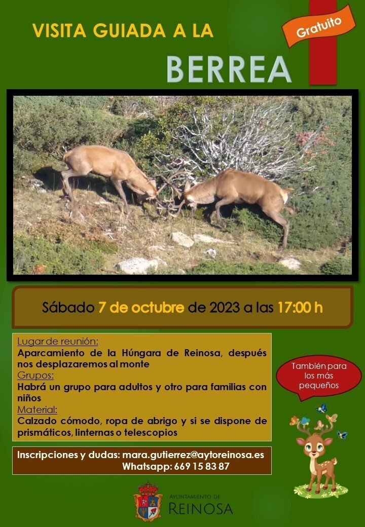 El Ayuntamiento de Reinosa ha organizado una visita guiada a la berrea para el sábado, 7 de octubre. La actividad está dirigida a participantes de todas las edades, por lo que se confeccionarán dos grupos: uno para adultos y otro para familias con niños. Se recomienda la utilización de calzado cómodo, ropa de abrigo y, si se tienen, prismáticos, linternas o telescopios.