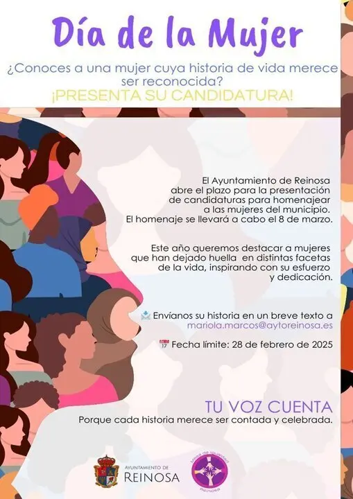 El Ayuntamiento de Reinosa ha abierto hasta el 28 de febrero el plazo para presentar candidaturas de mujeres que puedan recibir el homenaje del 8 de marzo, Día Internacional de la Mujer.