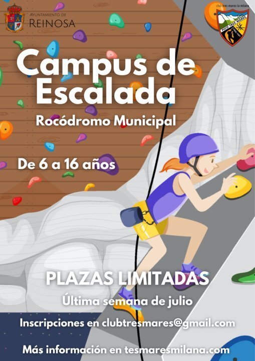 El Club Tres Mares La Milana ha programado junto con el Ayuntamiento de Reinosa un Campus de Escalada para niños y jóvenes de 6 a 16 años que se celebrará, del 22 al 26 de julio y de 9.00 a 13.00 horas, en el rocódromo municipal del Pabellón Tito Carrera.