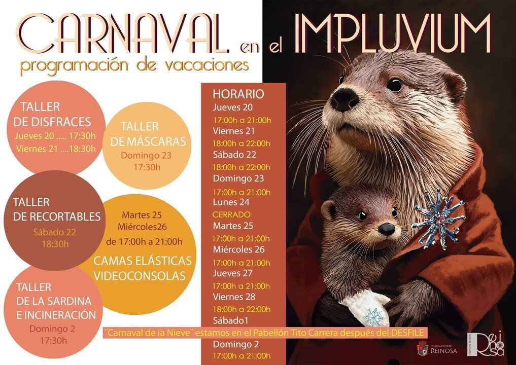 El centro socio-cultural Impluvium se suma, desde hoy, 20 de febrero, a la programación de Carnaval diseñada desde el Ayuntamiento de Reinosa a través de la Concejalía de Juventud con un calendario de actividades para los más jóvenes, que, precisamente, da comienzo, esta tarde, con un Taller de Disfraces que, también, se celebrará mañana, viernes.