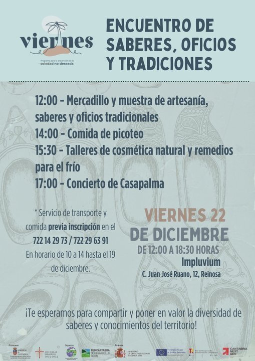 El programa “Viernes” dirigido a la prevención de la soledad no deseada, convoca un encuentro denominado Saberes, oficios y tradiciones, que tendrá lugar el viernes 22 de diciembre en el edificio del Impluvium, de 12 de la mañana a 6 y media de la tarde.