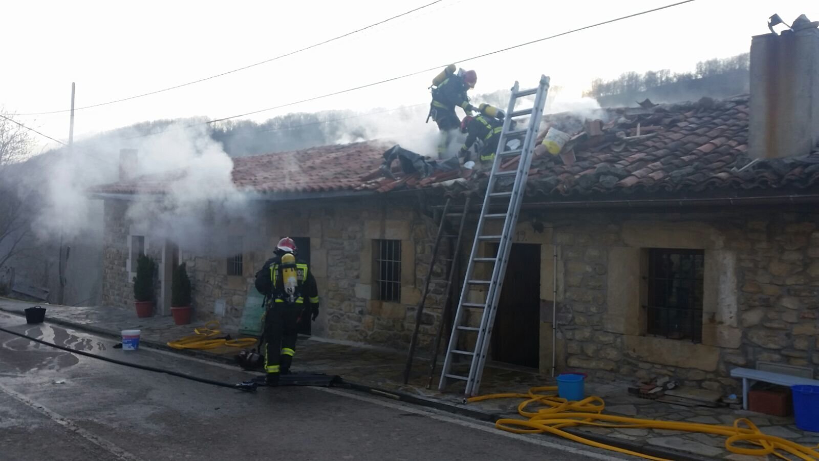 Bomberos del Servicio de Emergencias 112 del Gobierno de Cantabria, han extinguido esta mañana un incendio originado en una vivienda de Callecedo (Polaciones). El propietario ha sido trasladado por el 061 al Hospital de Sierrallana con pronóstico leve por inhalación de humo. El incidente se ha producido en una construcción de piedra y madera, de dos plantas y bajocubierta, con otras dos edificaciones adosadas a ambos lados. Las llamas se han originado en una habitación de la primera planta, y han afectado completamente a esta estancia y a la estructura del techo de la planta baja, suelo de la buhardilla y tejado. El Centro de Gestión de Emergencias 112 del Gobierno de Cantabria ha recibido una llamada alertando del incendio minutos antes de la 09:10 horas. Hasta el lugar se ha desplazado a bomberos del propio servicio autonómico, pertenecientes al parque de Tama, a sanitarios del 061, a voluntarios de Protección Civil de Rionansa con una autobomba para garantizar el abastecimiento de agua, y a miembros de la Guardia Civil. A su llegada, los efectivos del 112 han centrado su trabajo en extinguir las llamas y evitar la propagación del fuego a las viviendas colindantes, que solo se han visto afectadas por el humo, y al resto de las estancias de la casa en la que se ha originado el incendio. Con las llamas sofocadas han saneado la estructura eliminando viguetas con brasas y elementos con riesgo de caída, han revisado la zona afectada con cámara térmica para evitar que puntos calientes ocultos puedan reavivar el fuego, y han utilizado ventiladores de presión positiva para extraer la gran cantidad de humo generado, tanto de la casa incendiada como de las dos colindantes.