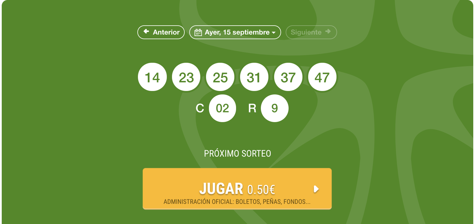 La combinación ganadora para este sorteo está conformado por los siguientes números 14 - 23 - 25 - 31 - 37 - 47, mas el complementario que ha correspondido al número 02 y el reintegro que ha recaído en el número 9. La recaudación para este sorteo ha ascendido al importe de 2.118.090,50€.