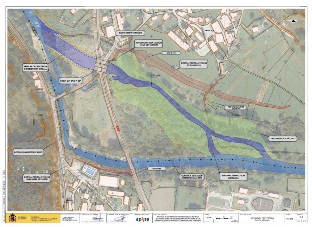Para ello, el proyecto plantea recuperar antiguos brazos del río Saja, actualmente sin funcionamiento, a los que se les dará continuidad hasta aguas abajo de Casar de Periedo, para lo que será necesario la construcción de una obra de drenaje bajo la carretera N-634 a su paso por Caranceja.
