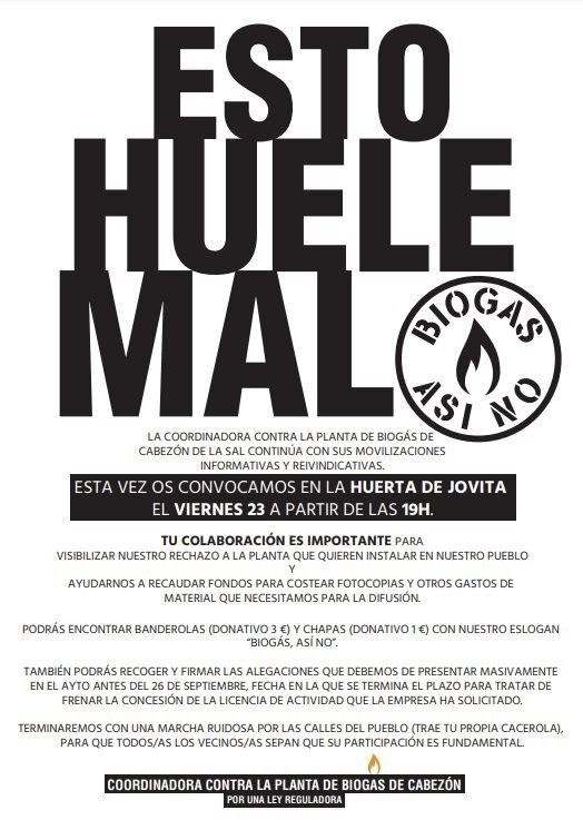 El acto comenzará a partir de las 19.00 horas, en la Huerta Jovita y se terminará con una "marcha ruidosa" por las calles de la localidad, para que "todos los vecinos sepan que su participación" en contra de este proyecto de planta de biogás es "fundamental".