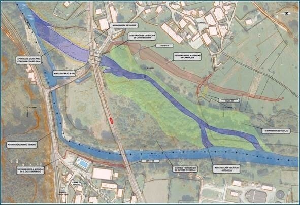 Junto con estas propuestas, y con el fin de favorecer la mejora de la calidad genética y ecológica de las comunidades vegetales en el cauce recuperado, se implantarán tratamientos de silvicultura, mitigación y control de especies exóticas y recolonización con variedades autóctonas establecidas en otros tramos del río.