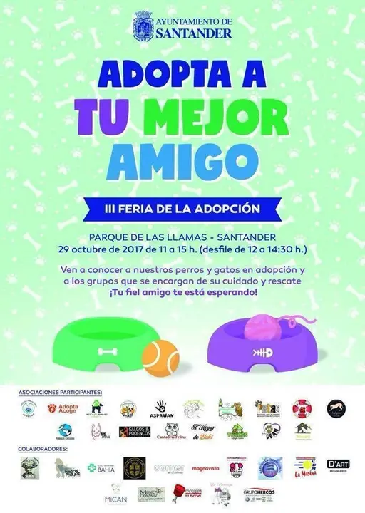 El Parque de Las Llamas de Santander acogerá este domingo, 29 de octubre, la III Feria de Adopción de Animales, que pretende promover entre los ciudadanos la adopción de animales abandonados en lugar de su adquisición, así como la difusión de información sobre la responsabilidad que comporta tener una mascota.