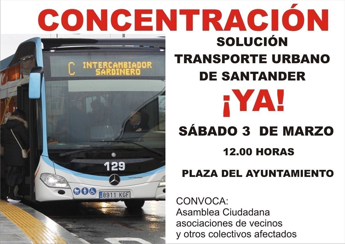La 'Asamblea Ciudadana por la movilidad y Metro-TUS', creada la pasada semana por una veintena de asociaciones vecinales, estudiantes y otros colectivos, ha convocado para este sábado, 3 de marzo, a las 12.00 horas, en la plaza del Ayuntamiento, una concentración contra el nuevos sistema del Metro-TUS y la reordenación de líneas de autobús implantada por el equipo de Gobierno (PP) de Santander.