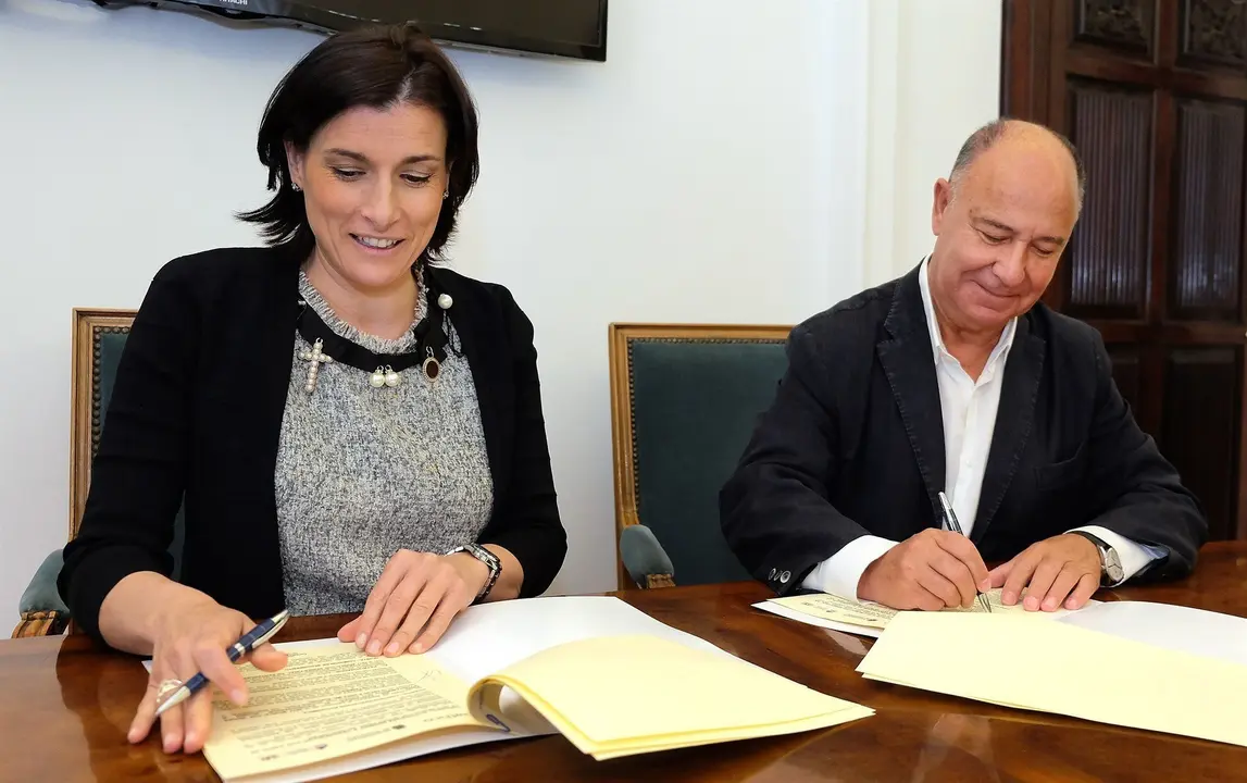 La alcaldesa de Santander, Gema Igual, y José Luis López Cortés, en representación de Bathco, han suscrito este miércoles el convenio por el que la empresa se incorpora como patrocinador a la Copa del Mundo de Vela, que se celebrará del 4 al 11 de junio en aguas de la bahía santanderina