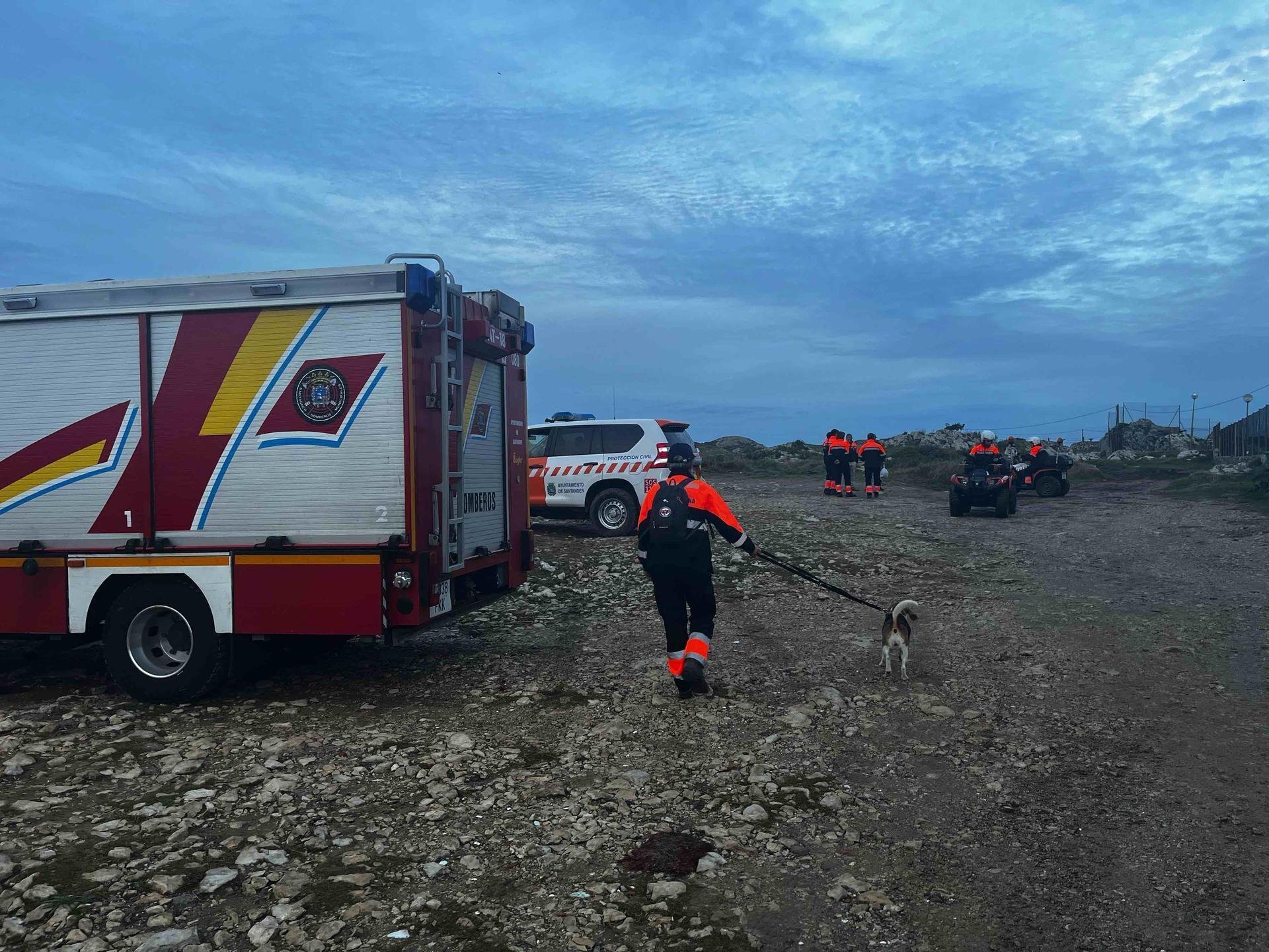 Desde tierra, un técnico de Protección Civil Santander ha coordinado a Bomberos de Santander y a un nutrido grupo de voluntarios que trabajan a pie, en quad y con perros de rastreo y han batido un importante área de búsqueda sin éxito.