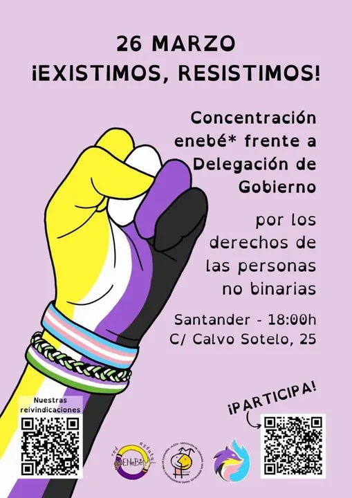 La Asociación de Lesbianas, Gais, Bisexuales, Trans, Intersexuales y más de Cantabria, ALEGA, ha convocado para este jueves, 26 de marzo, una concentración por los derechos de las personas no binarias que tendrá lugar en Santander, frente a la Delegación del Gobierno, a las 18.00 horas.