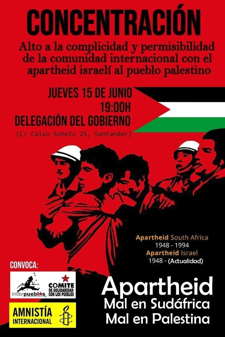 El Comité de Solidaridad con los Pueblos-Interpueblos y Amnistía Internacional han convocado una concentración este jueves 15, a las 19.00 horas junto a la Delegación del Gobierno en Cantabria, contra el "apartehid israelí al pueblo palestino".