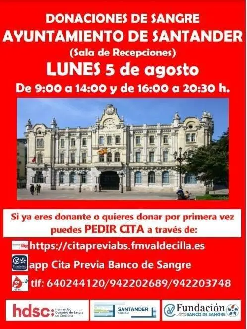 El Ayuntamiento de Santander acogerá este lunes, 5 de agosto, un punto de donación de sangre, gracias a la colaboración que mantienen el Consistorio santanderino con el Banco de Sangre y la Hermandad de Donantes de Cantabria, que necesitan sangre para los grupos A+, A-, 0- y 0+ con reservas bajas en la actualidad.