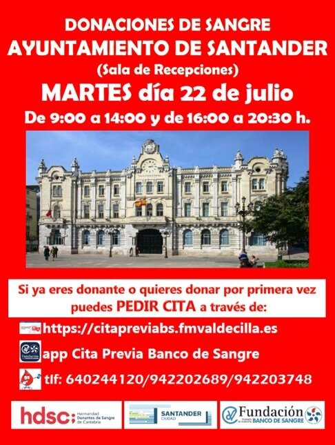 El Salón de Recepciones del Ayuntamiento de Santander acogerá este martes, 22 de julio, un punto de donación de sangre, gracias a la colaboración que mantiene el Consistorio con el Banco de Sangre y la Hermandad de Donantes de Cantabria.