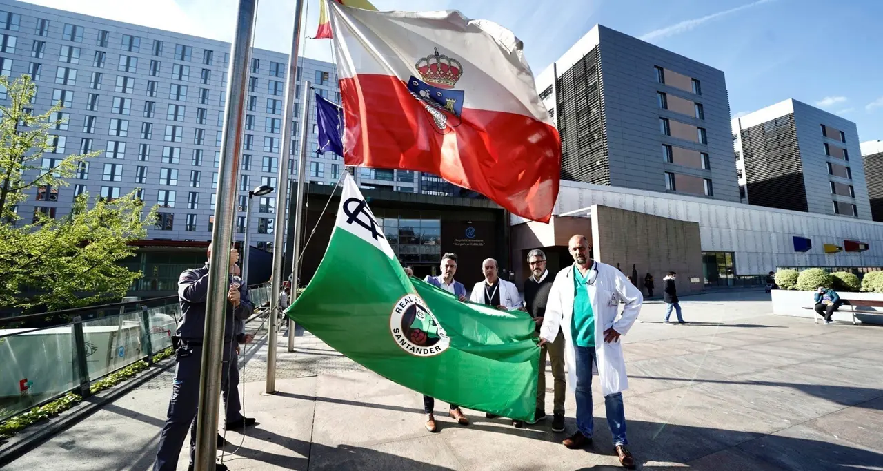 El Hospital Universitario Marqués de Valdecilla ha colocado en su fachada principal la bandera del Racing -que ya ondea junto a las de España, Cantabria y Europa- como apoyo al equipo cántabro en su camino hacia Segunda División.