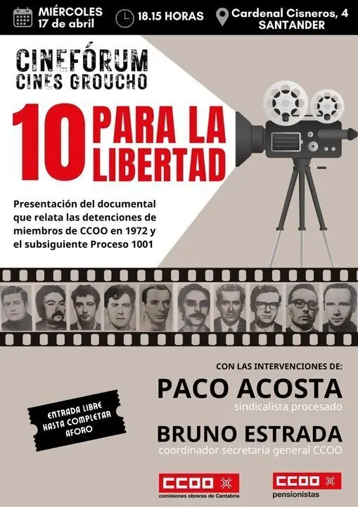Comisiones Obreras de Cantabria (CCOO) y la Federación de Pensionistas de CCOO en Cantabria traerán a Santander la proyección del documental '10 para la libertad. El proceso 1001 contra la clase trabajadora', que narra las detenciones realizadas en 1972, cuando la dirección del sindicato estaba reunida en Madrid y el subsiguiente proceso judicial, conocido como proceso 1001.