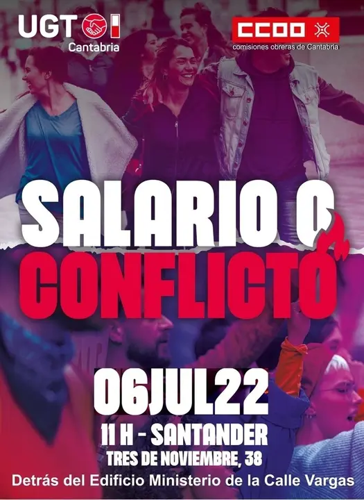 CCOO y UGT han convocado concentraciones en toda España el 6 de julio, bajo el lema 'Salario o conflicto', para exigir que se mejoren los salarios de la clase trabajadora. En Cantabria, la movilización será a partir de las 11.00 horas, frente a la sede de la CEOE de Santander.