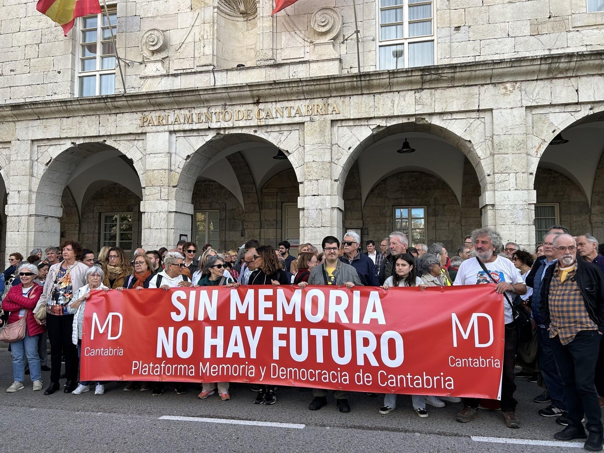 Un centenar de personas se ha concentrado este lunes frente al Parlamento de Cantabria para defender la Ley de Memoria Histórica y Democrática de la comunidad, que el actual Gobierno autonómico (PP) quiere derogar, sosteniendo una gran pancarta bajo el lema 'Sin memoria no hay futuro'.