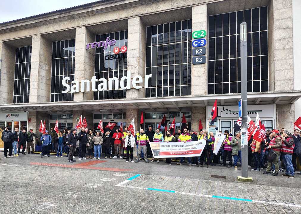 Alrededor de medio centenar de trabajadores de Renfe se han concentrado este mediodía a las puertas de la estación de Santander para denunciar la situación "precaria" en la que se encuentra la infraestructura ferroviaria y exigir un aumento de plantilla en esta empresa pública y en Adif.