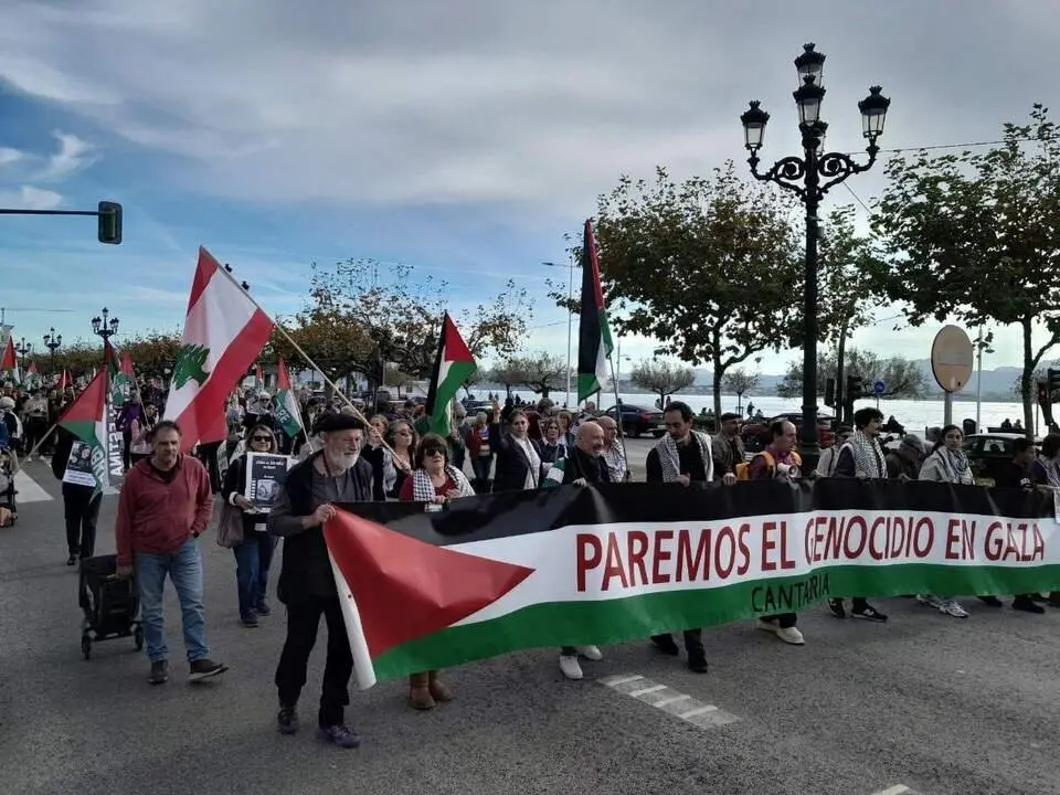 Cientos de personas se han manifestado este sábado en Santander como muestra de solidaridad con Palestina y para exigir al Gobierno el fin al comercio de armas y las relaciones con Israel, así como el alto "definitivo del genocidio del pueblo palestino".