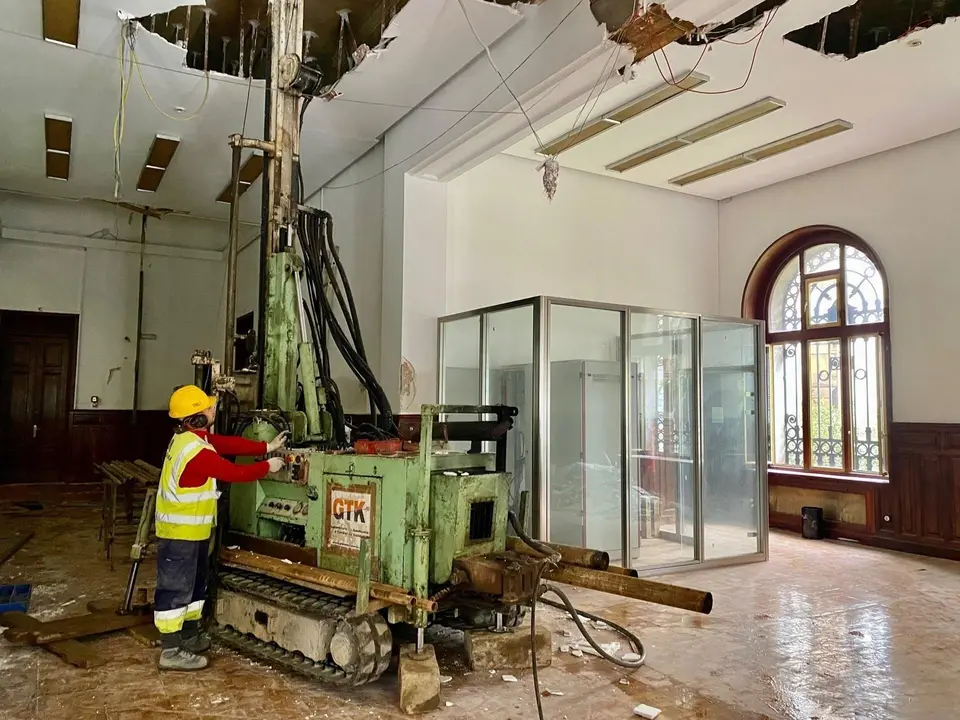 Del mismo modo, se están ejecutando cuatro sondeos interiores, bajo los cuatro núcleos de comunicación proyectados, con el objetivo de conocer la tipología del terreno y el nivel de la roca bajo el edificio, -hasta el nuevo sótano -2 proyectado-, para el futuro apoyo de la cimentación y el desarrollo de la estructura general del futuro museo.