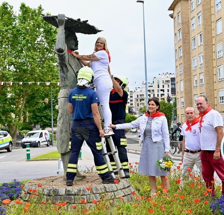 La alcaldesa, Gema Igual, y representantes de la asociación de vecinos de Tetuán han participado este mediodía en el acto simbólico de colocación del pañuelo de San Fermín a la estatua de la Sardinera, en la rotonda de entrada al barrio.