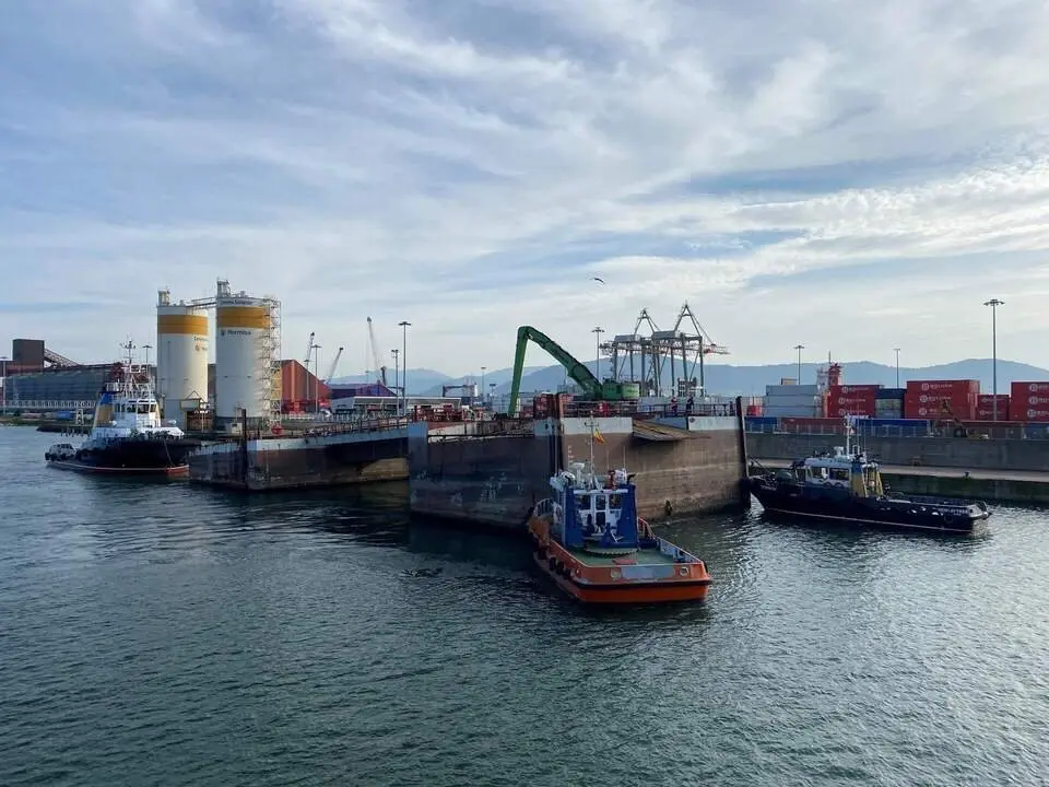 Una operación "compleja" por el paso a través del puente levadizo y por su colocación en la rampa de varada, cuyas operaciones fueron realizadas por la empresa de remolque RUSA con la asistencia de los prácticos del puerto.