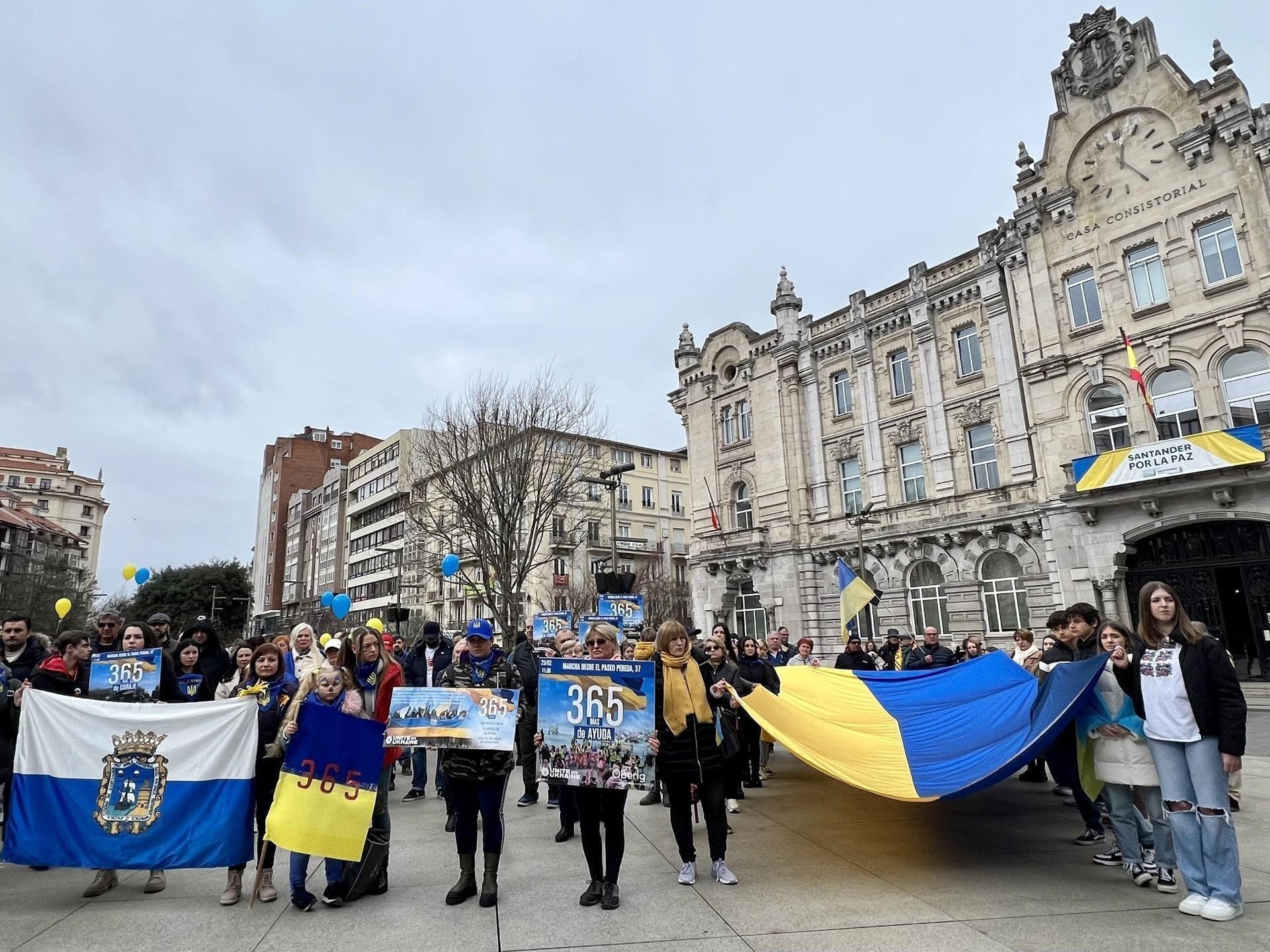 A las banderas de Ucrania se han sumado también algunas de España y de Santander, con las que el colectivo ucraniano ha querido dar las gracias al apoyo recibido tras tener que abandonar su país, así como carteles con la inscripción '365 días de ayuda'.