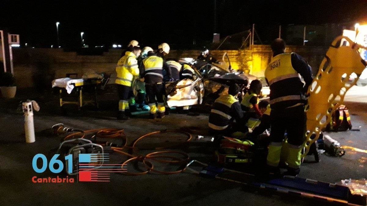 Los bomberos de Santander tuvieron que liberar al copiloto, que quedó atrapado entre los restos del coche y que es uno de los jóvenes que ha resultado herido grave.