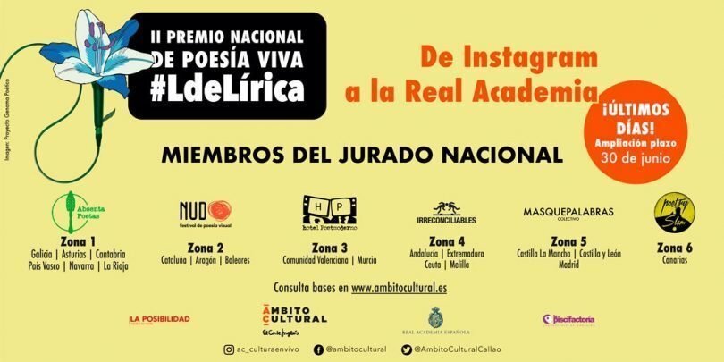 El Premio Nacional de Poesía Viva #LdeLírica ha sido convocado por Ámbito Cultural, con la colaboración de Piscifactoría Laboratorio de Creación y La Posibilidad, que han concebido este premio de poesía viva, recitada, contemporánea y oral para dar a conocer el talento emergente utilizando para ello Instagram.