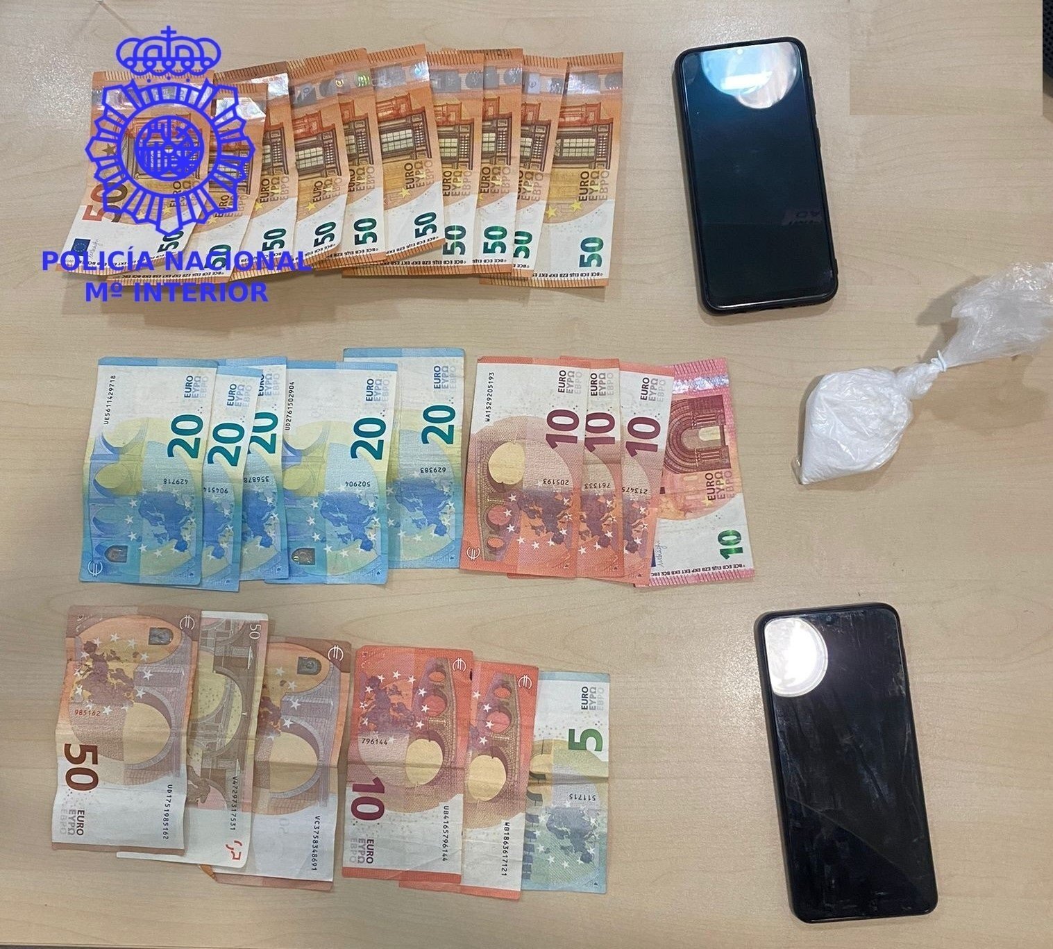 Los agentes procedieron a interceptar el vehículo y a realizar un registro, encontrando entre sus pertenencias 315 euros fraccionados en billetes y otros 500 en billetes de 50 euros, así como un envoltorio de cocaína con un peso aproximado de 26 gramos y cuyo valor en el mercado podría haber alcanzado los 1.530 euros.
