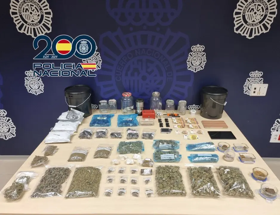 En el registro incautaron: 1.645 gramos de marihuana y 1.200 de hachís; 460 dosis de hachís en polvo (botes pequeños de plástico) y 17 dosis de marihuana, preparadas para la venta; diez porros; "gran cantidad" de botes de cristal con diferentes tipos de marihuana y de tuppers con hachís; 400 botes pequeños vacíos para dosis de hachís en polvo; una trituradora metálica de marihuana; dos balanza; dos tablet, cinco teléfonos móviles, 600 euros en efectivo y diversos útiles destinados a la actividad ilícita.