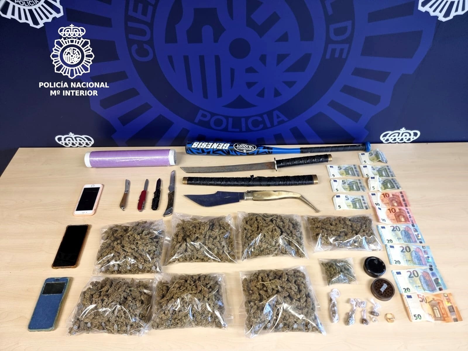Allí se incautaron 600 gramos de cogollos de marihuana envueltos en plástico, varios trozos de hachís envueltos en papel film y preparados para la venta, 160 euros fraccionado en billetes, así como diferentes útiles para manipular las drogas. Y también, un bate de béisbol, una katana, cinco navajas y tres teléfonos móviles.