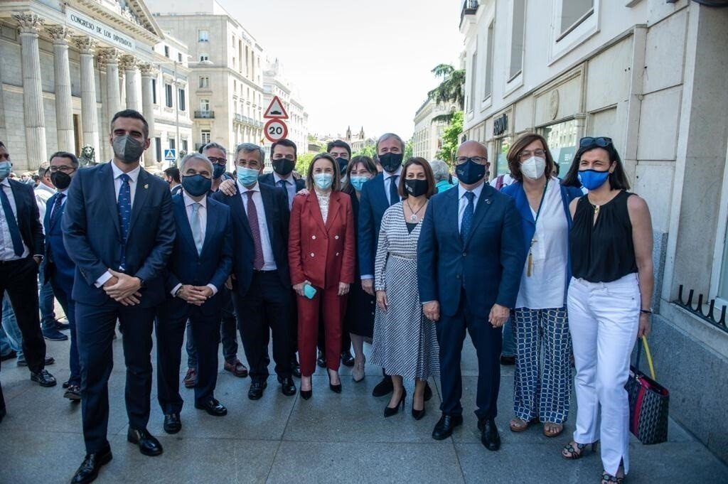 Antes de partir andando hasta la sede del Ministerio de Hacienda, el presidente del PP, Pablo Casado, se ha fotografiado en la escalinata del Congreso de los Diputados, junto con la portavoz del PP, Cuca Gamarra, con todos los representantes municipales del partido que han acudido a Madrid para asistir a la lectura de este manifiesto, entre los que se encuentra Gema Igual.