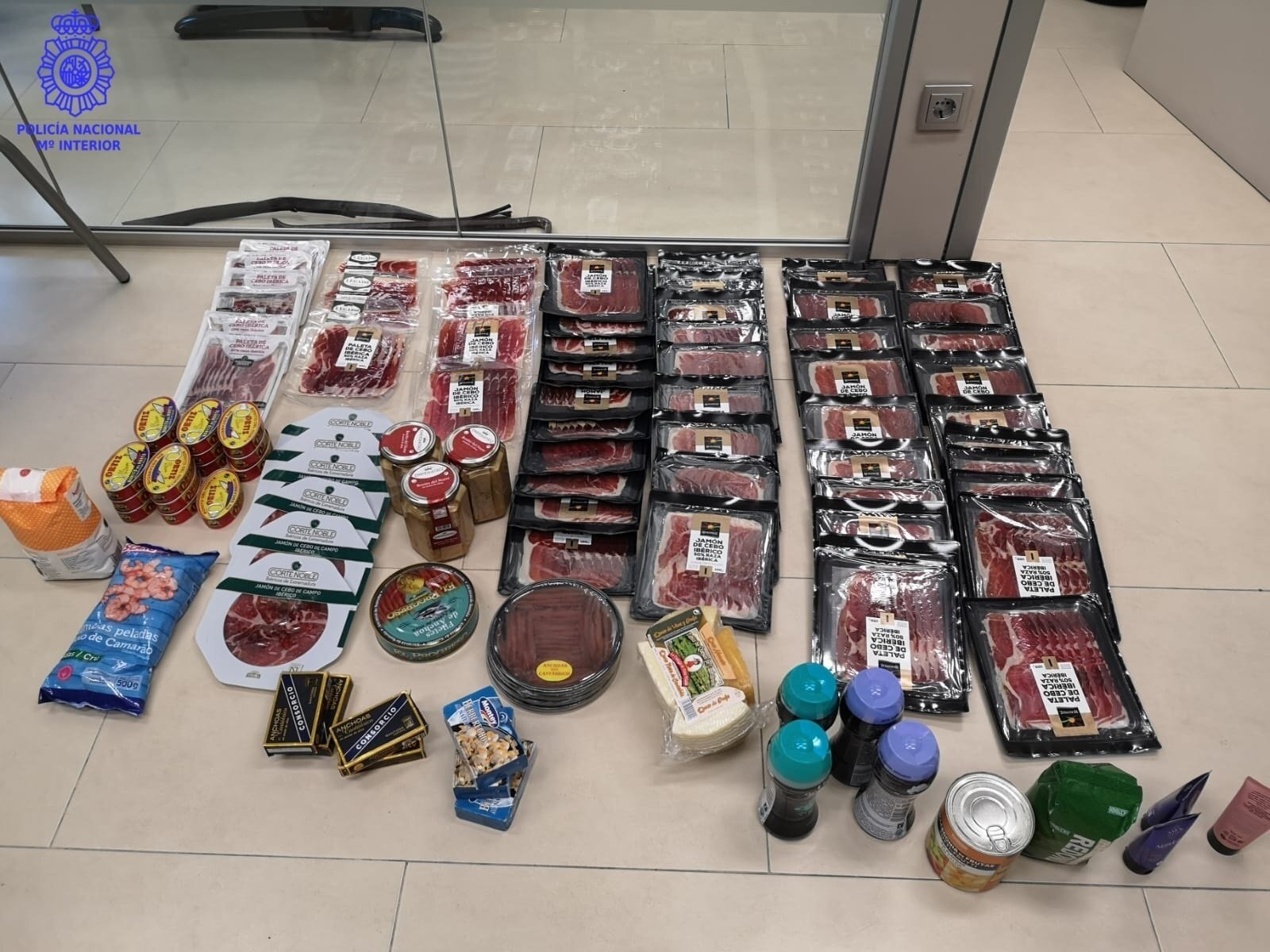 Los agentes trasladaron a la mujer a dependencias policiales para su identificación y le incautaron 65 euros y 106 productos, entre ellos 16 latas de bonito, 3 de berberechos y 8 de anchoas, varios paquetes de jamón ibérico, una bolsa de gambas, dos tablas de quesos, un paquete de arroz, un bote de macedonia de frutas, un paquete de azúcar, cuatro botes perfumados para la ropa, crema de manos o un perfume.