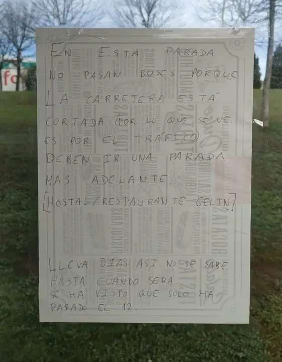 'En esta parada no pasan buses porque la carretera está cortada (por lo que se ve es por el tráfico). Deben ir una parada más adelante (Hostal/Restaurante Gelín). Lleva días así. No se sabe hasta cuándo será. Se ha visto que sólo ha pasado el 12', reza el cartel que han colocado los vecinos o comerciantes de la zona en la marquesina, según el PRC.