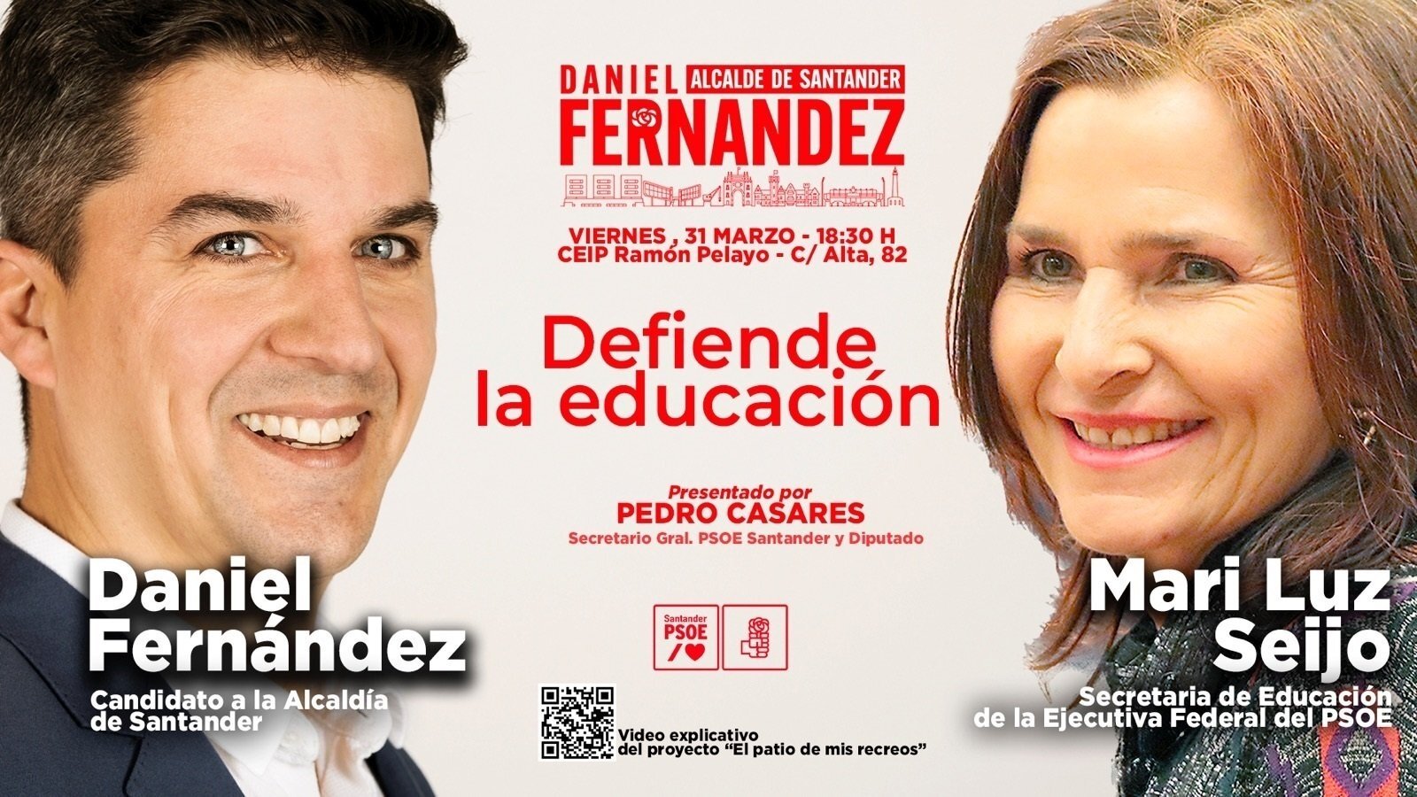 El PSOE de Santander celebrará este viernes, 31 de marzo, a partir de las 18.30 horas, una jornada con el título 'Defiende la Educación' en el colegio Ramón Pelayo, en el que está previsto que intervengan el portavoz en el Ayuntamiento y candidato a la Alcaldía, Daniel Fernández, y la secretaria de Educación del PSOE, Mari Luz Martínez Seijo.