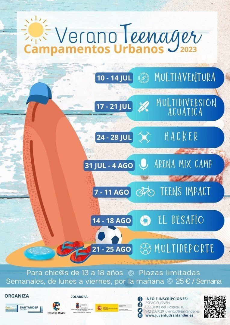 El Ayuntamiento de Santander abre este lunes el plazo de inscripción para la celebración de una nueva edición del 'Verano Teenager', que en esta ocasión ofrecerá siete campamentos urbanos semanales dirigidos a cubrir el tiempo de ocio de adolescentes y jóvenes de la ciudad durante las vacaciones estivales.