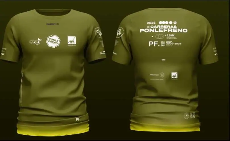 Ponle Freno estrena también un nuevo diseño de camiseta para las carreras de 2026, que estará diseñado en esta ocasión por Luanvi y, por primera vez, será de color verde oliva con degradado amarillo en la parte inferior.