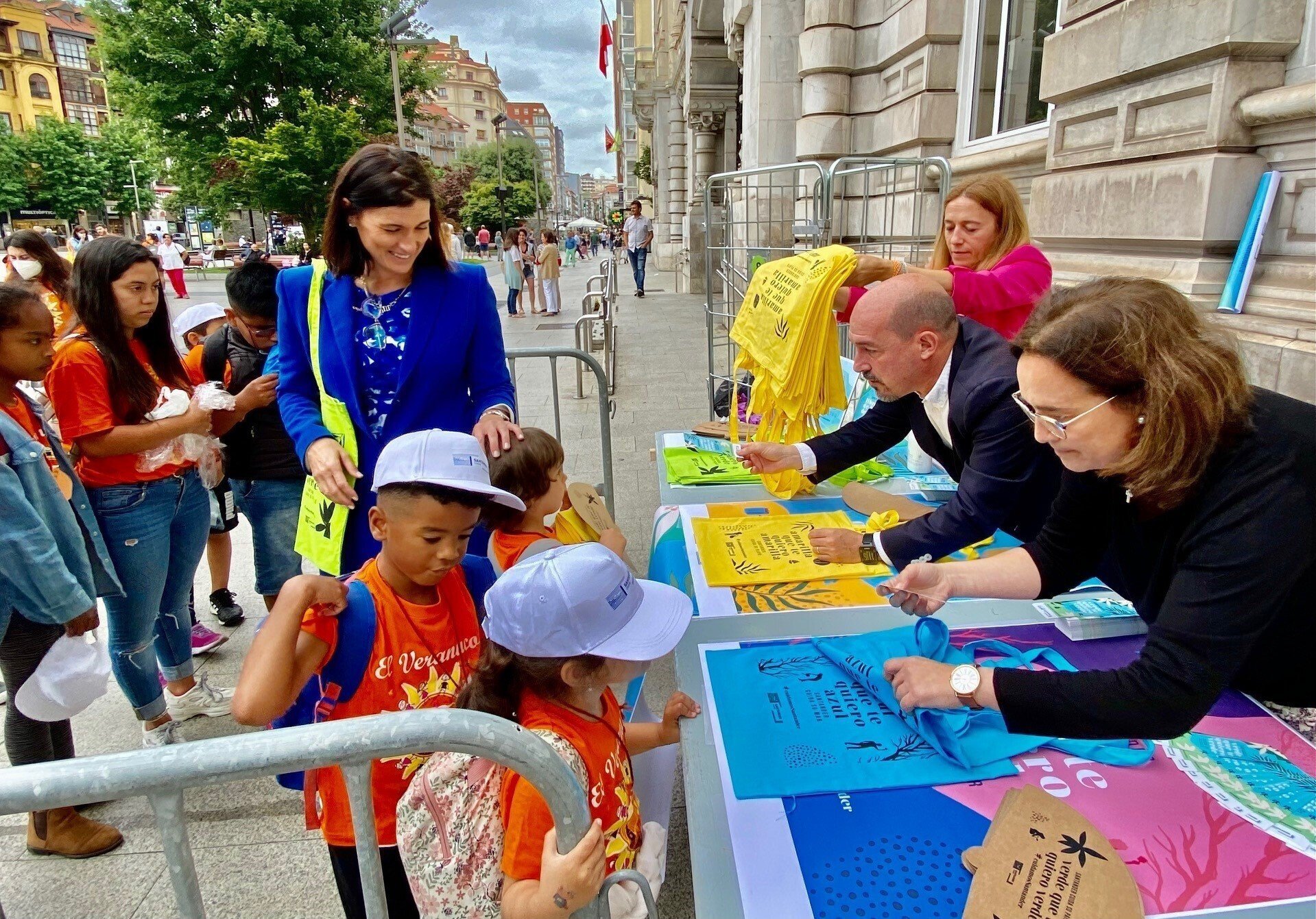 El reparto de las bolsas, en colores diferentes, se lleva a cabo en la Plaza del Ayuntamiento, donde esta mañana han acudido la alcaldesa, Gema Igual, acompañada de un grupo de niños participantes de 'El Veranuco', y de los concejales de Medio Ambiente y Servicios Sociales, Margarita Rojo y Álvaro Lavín.
