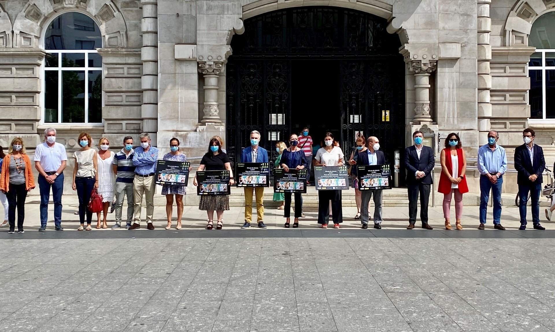 La plaza del Ayuntamiento de Santander ha acogido este mediodía un minuto de silencio para condenar los dos últimos asesinatos por violencia de género ocurridos en Mallorca y Santa Cruz de Tenerife, en el que han participado miembros de la Corporación municipal, trabajadores y ciudadanos.