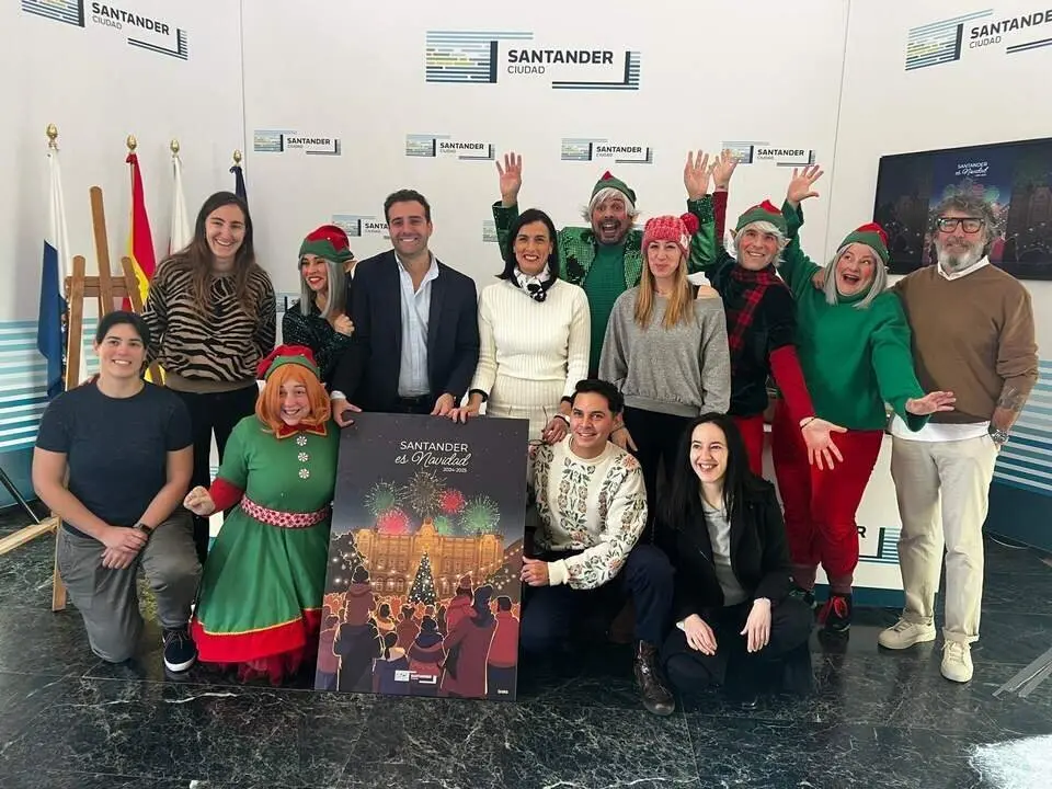 La alcaldesa de Santander, Gema Igual, acompañada del concejal de Turismo y Dinamización Social, Fran Arias, y un grupo de elfos, ha presentado este miércoles la programación navideña que, entre sus novedades, contará con una ruta de nueve talleres en la que, bajo el título 'Viaje a la Navidad en Europa'.