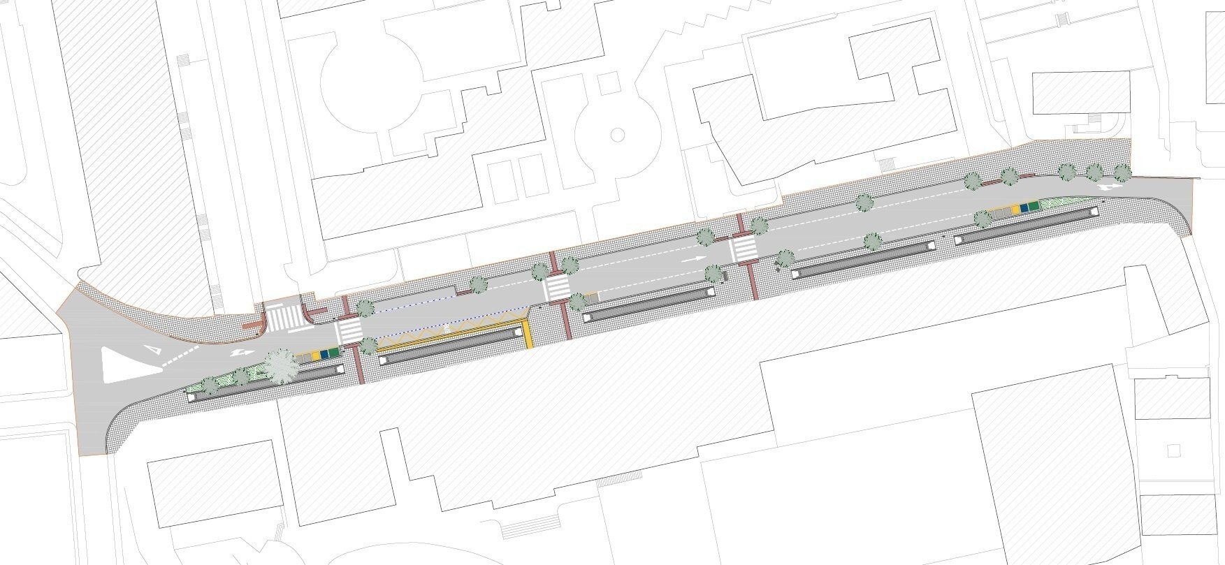 El trazado de los elementos mecánicos se desarrollará por la acera sur, la que colinda con el colegio, ya que cuenta con menos condicionantes que la acera norte, donde se encuentran numerosos vados y entradas a garajes, portales, comunidades o establecimientos comerciales.